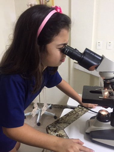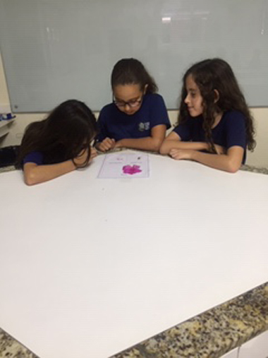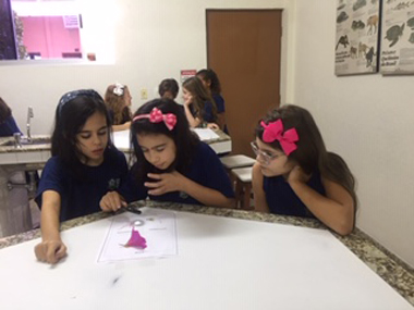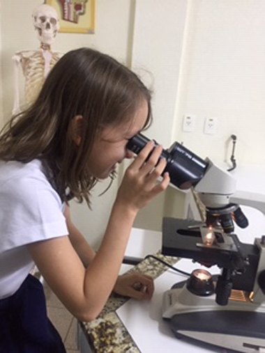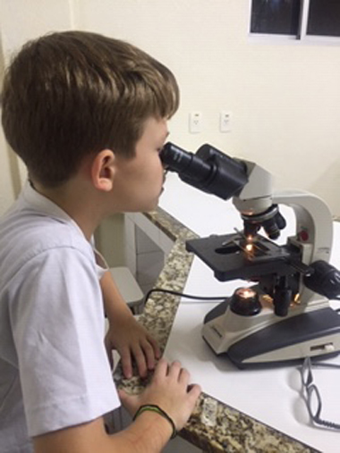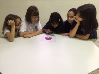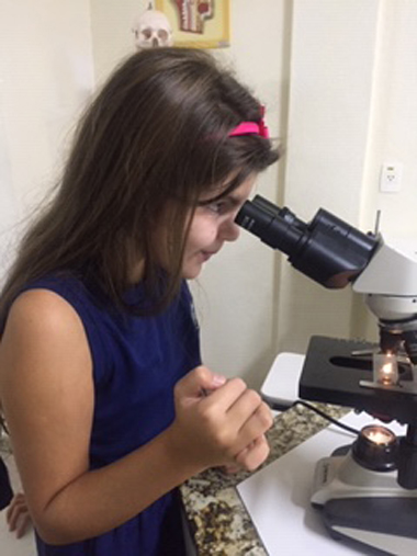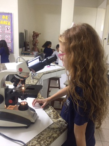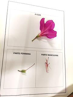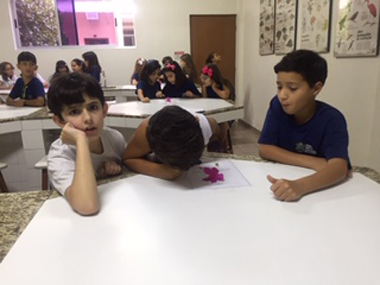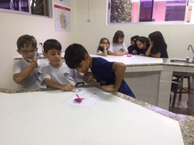 Os alunos analisaram a flor utilizando a lupa e depois através do microscópio.