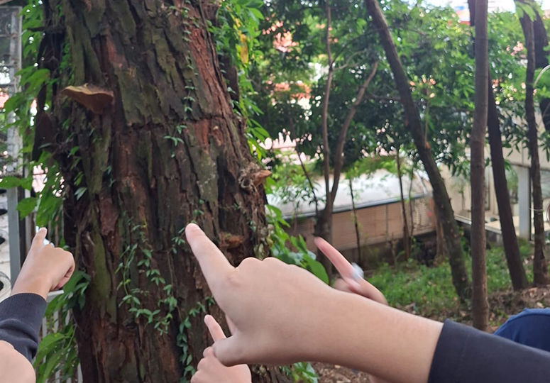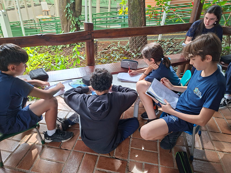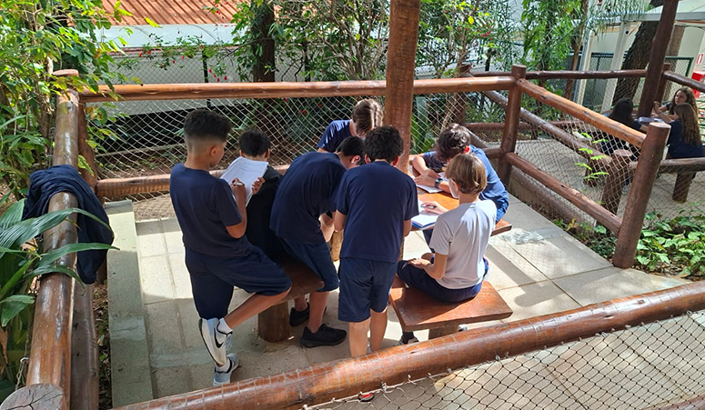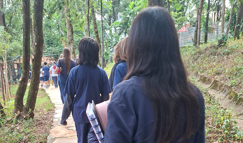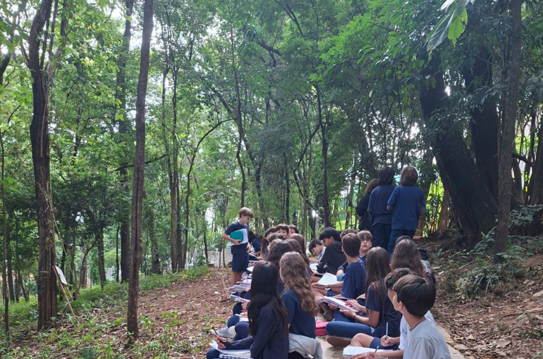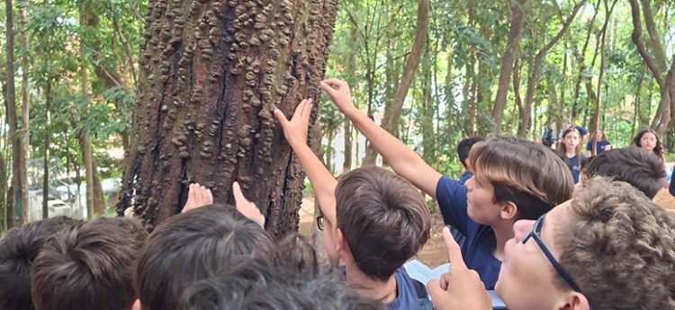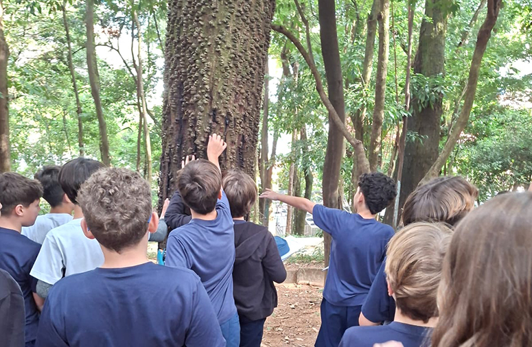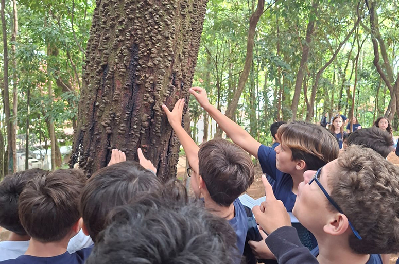 Os estudantes tiveram uma aula na Mata do Colégio para reconhecer plantas, identificando seus nomes populares (musgos, costela-de-adão, angico, bananeira, jabuticabeira, entre outras), e espécies como lÃquens, que são bioindicadores da qualidade do ar.