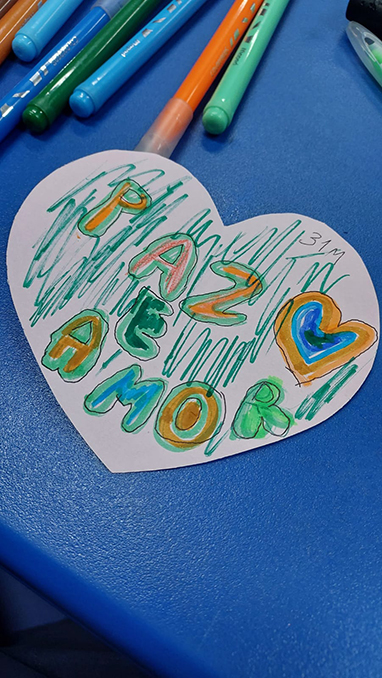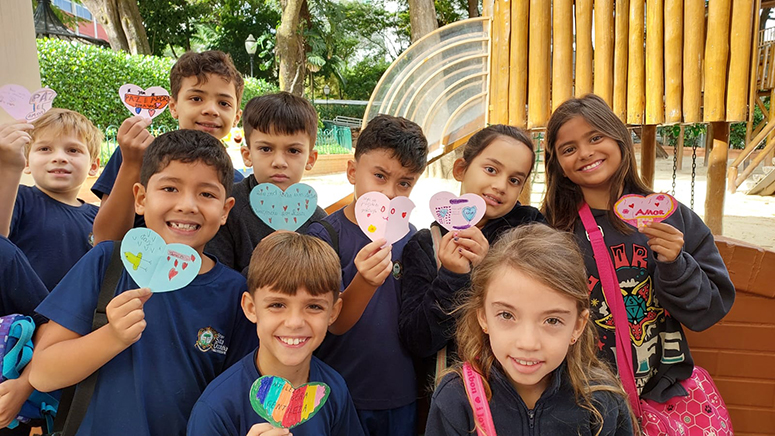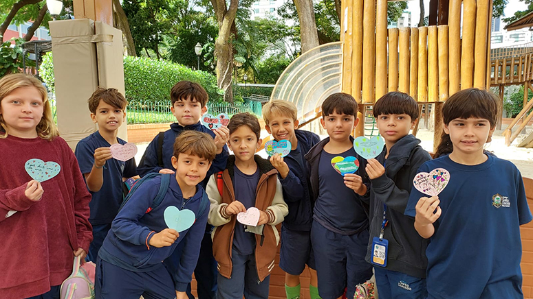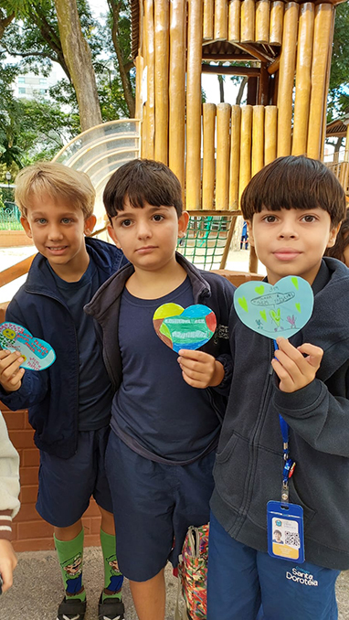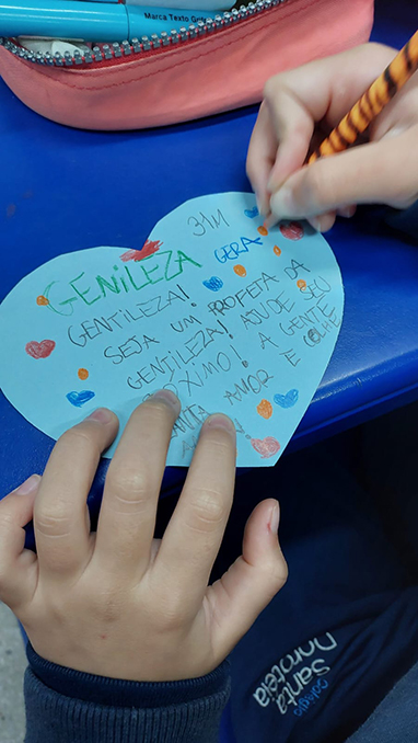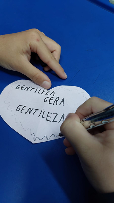 No Ensino Fundamental 1, os estudantes prepararam cartões com mensagens de paz e amor para trocarem entre si e fizeram ilustrações para frases em inglês que evidenciam palavras de ordem contra o bullying.