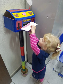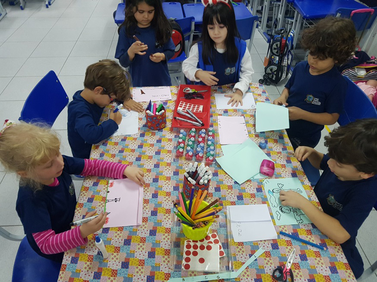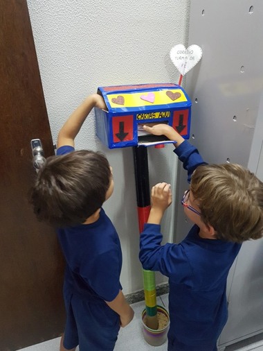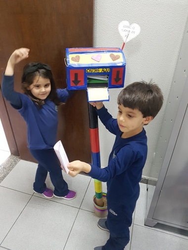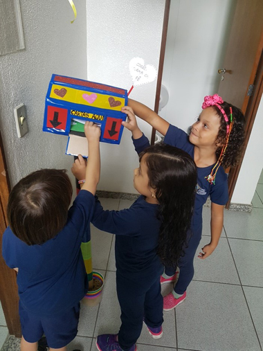 A turma da professora Fernanda Corrêa tem uma caixa muito especial em sala: um Correio. Mas as cartas que chegam não são do carteiro e sim dos alunos da sala. As crianças, desde o primeiro semestre, trocam cartas, bilhetes e convites. É um momento muito especial para a turma! Olhinhos atentos ao final do dia: