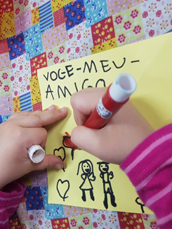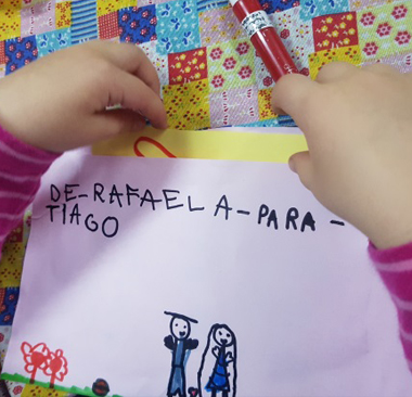 No início, conta a professora Fernanda, “o meu objetivo foi possibilitar o estabelecimento de vínculos entre as crianças. Deu certo. Atualmente, minha intenção é outra, mergulhar as crianças no mundo da escrita. As cartas são escritas espontaneamente, em casa ou na escola, às vezes, as crianças solicitam o auxílio dos pais e da professora. As famílias entraram na onda, também utilizam do Correio para enviar mensagens para os filhos.”