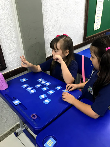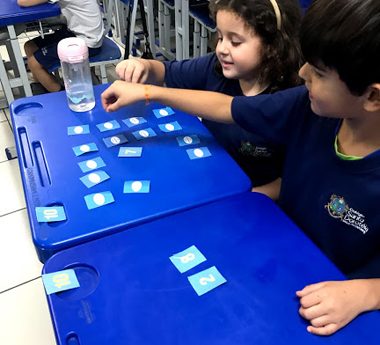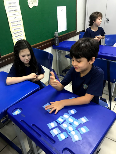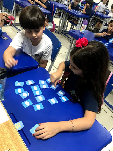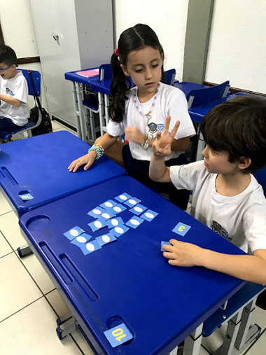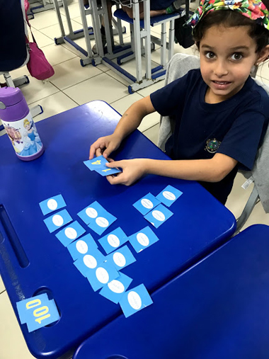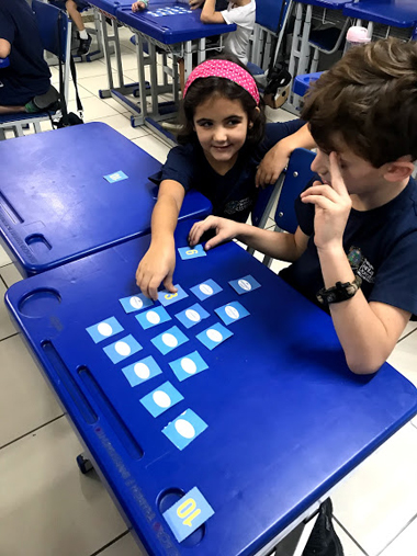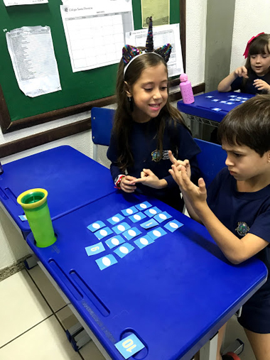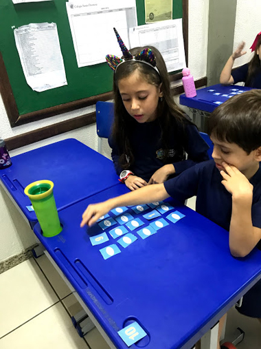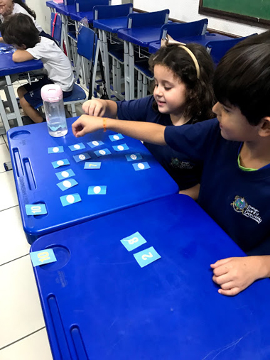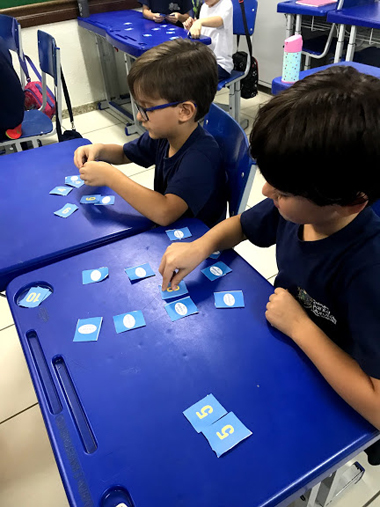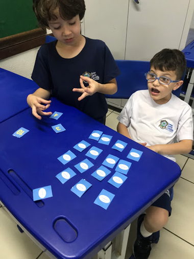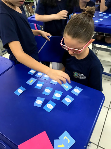 As crianças uniram suas cartas e viraram os números para baixo. Um de cada vez tirava uma carta e verificava os números que saíram. Se o resultado da soma entre as cartas for 10, estas duas cartas vão para o monte desta criança. Caso não dê exatamente 10, as cartas são viradas novamente para baixo.