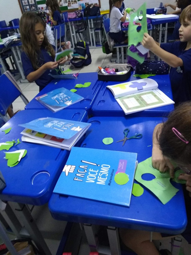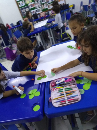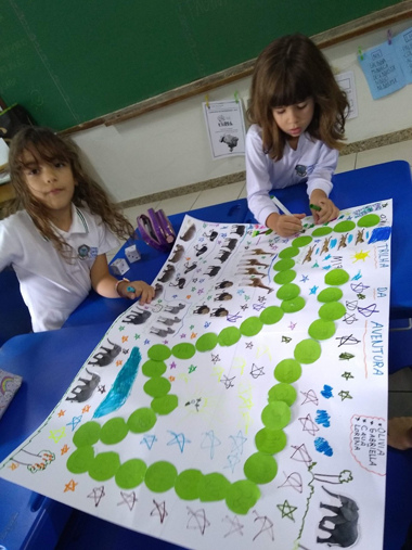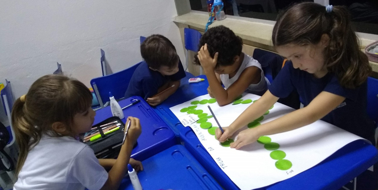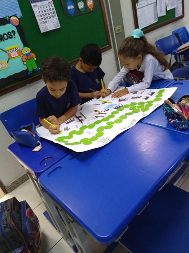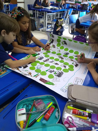 Os alunos montaram a trilha em grupo e depois jogaram. Uma atividade significativa e que proporcionou a retomada de habilidades da disciplina de Matemática, além de trabalhar habilidades de convivência em grupo e de espírito de equipe.