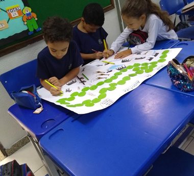 Os alunos montaram a trilha em grupo e depois jogaram. Uma atividade significativa e que proporcionou a retomada de habilidades da disciplina de Matemática, além de trabalhar habilidades de convivência em grupo e de espírito de equipe.