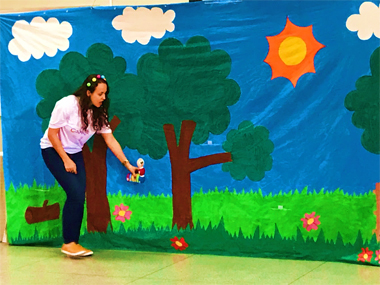 A história foi contada em Inglês com cenário, fantoches, música e participação das crianças.