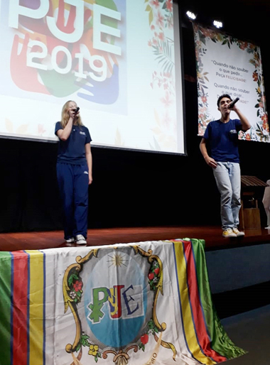 Iniciamos com uma acolhida realizada pelos estudantes da PJE do Ensino Médio (Pedro Sette, Júlia Diniz e Luísa Bahia, todos do 2º ano), colocamo-nos também diante de Deus em bendição e ação de graças pela caminhada que já estamos realizando, nos solidarizamos com a dor do Brasil no contexto de Suzano, bem como apresentamos as trilhas formativas da PJE para este ano, a saber: Espiritualidade, Carisma, Missão – Solidariedade e Competências Socioemocionais das Juventudes e Atualidades. Contamos ainda com a presença generosa de duas frentes de inserção social que nos acolhem nesta caminhada com os jovens: a AMR, representada pelo educador físico Leonardo, e a ONG “Banho de Amor”, que atende, semanalmente, a população de rua de Belo Horizonte, representada pela voluntária e coordenadora da ONG, Maria Alice. Os representantes destas frentes sensibilizaram os nossos estudantes e familiares presentes para a importância de nossa presença junto àqueles que são assistidos em seus programas.