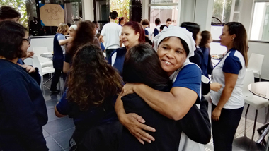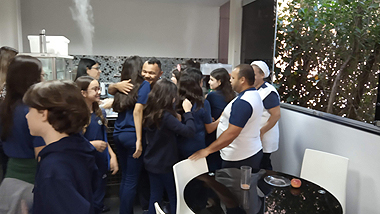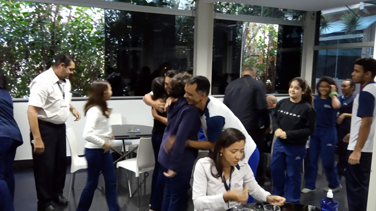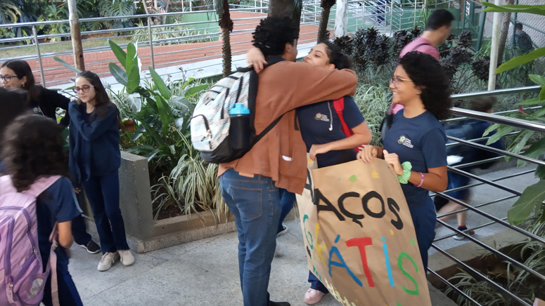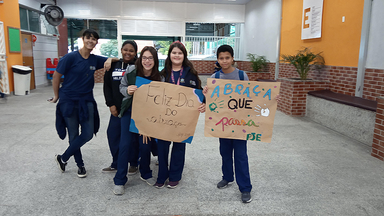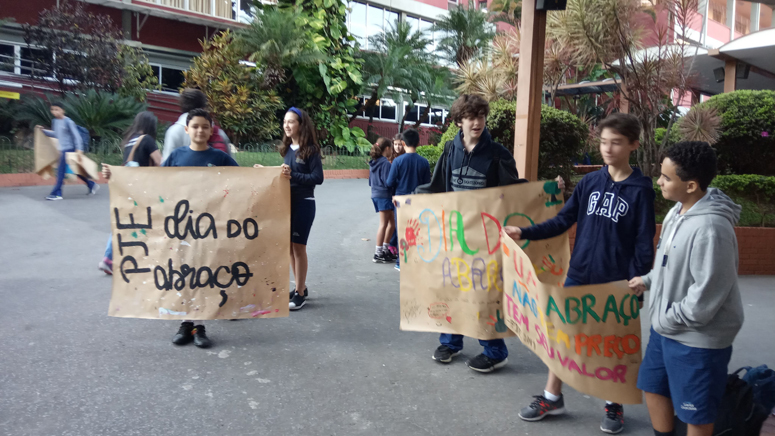 A atividade foi realizada na chegada dos alunos no turno da manhã, nas três portarias da escola e na entrada do estacionamento. Além da acolhida no início da manhã, alguns alunos da PJE foram ao refeitório no horário de lanche dos funcionários e dos professores do Ensino Fundamental 1 para desejar a eles, também, um feliz Dia do Abraço e demonstrar todo o carinho que têm por aqueles que, de forma silenciosa e discreta, fazem a nossa escola funcionar diariamente.