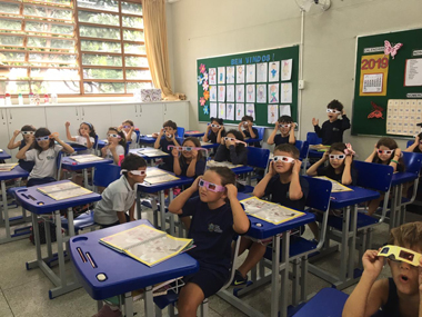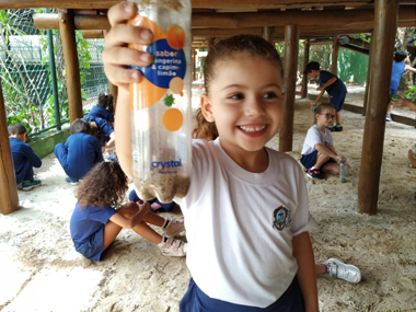 Estudantes do 1º ano do Ensino Fundamental constroem e exploram com seus óculos a tecnologia 3D e trabalham os sentidos ao montar um chocalho.