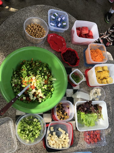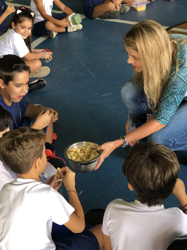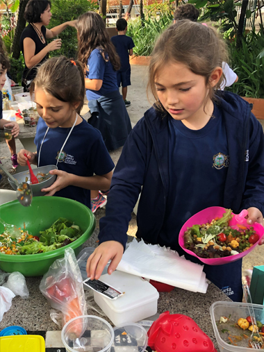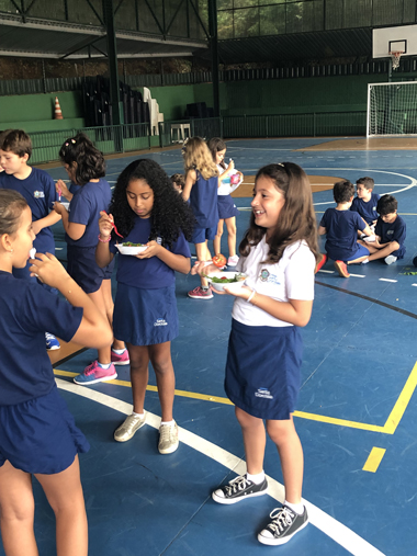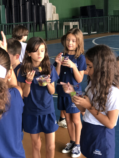 Estudantes do 3º ano do Ensino Fundamental confeccionam uma salada de frutas em projeto interdisciplinar com professora regente e aprendem matemática em inglês.
