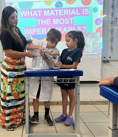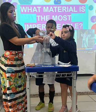 As turmas participaram de um experimento de ciências focado em testar a permeabilidade de três materiais: tecido, papel e plástico,levantando hipóteses sobre qual desses apresentaria maior impermeabilidade, em inglês: “It’s permeable!” ou “It’s impermeable!”.