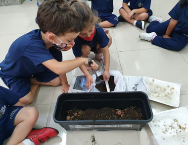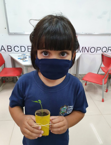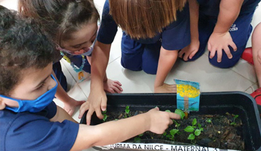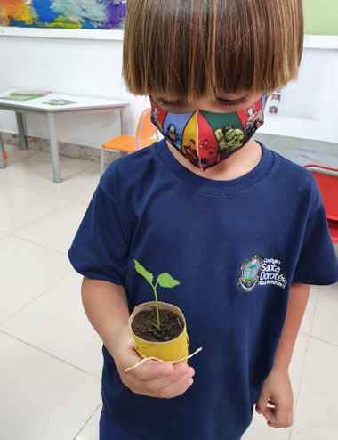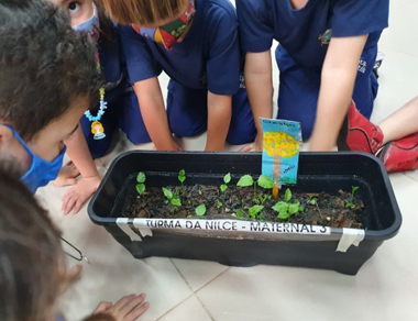 Todos os dias observávamos o plantio para ver o que acontecia. E um dia apareceu uma pontinha verde. Nasceu! Estamos muito felizes! Somos guardiões da natureza. Agora vamos levar para casa a nossa plantinha.