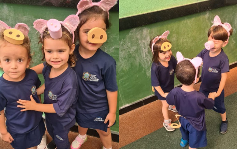 A história Os Três Porquinhos foi encenada de forma dinâmica, com as crianças participando ativamente das cenas, representando os sentimentos dos personagens e suas próprias emoções, enquanto encenavam momentos de medo, alegria e tristeza. Esse tipo de atividade promove o aprendizado da Língua Inglesa e favorece a expressão emocional e a comunicação entre os pequenos.