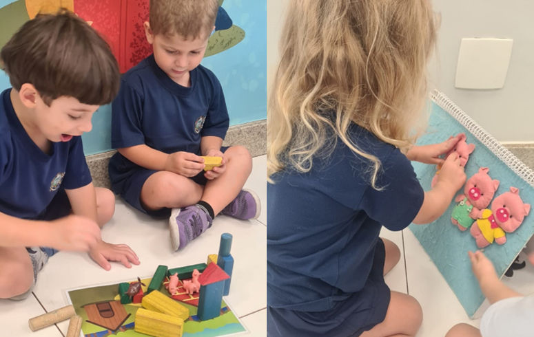 As histórias não são apenas uma maneira divertida de aprender. Elas são uma poderosa ferramenta para desenvolver conhecimentos diversos e habilidades socioemocionais. Com base no clássico texto The Three Little Pigs (Os Três Porquinhos), as crianças do Maternal 2 experienciaram propostas ricas em aprendizado e crescimento emocional.