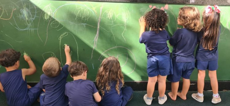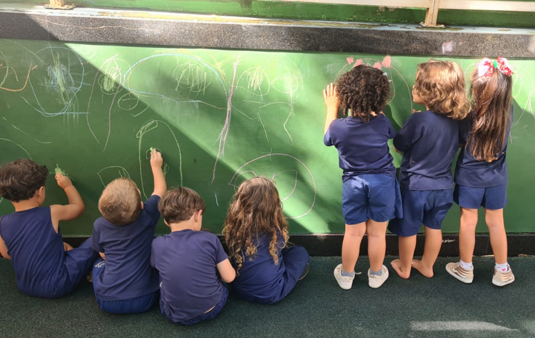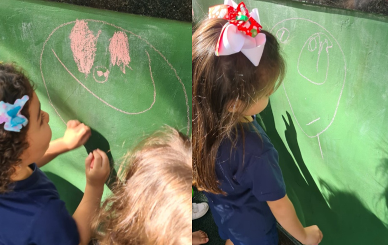 Além disso, foram trabalhadas as partes do corpo e do rosto de maneira divertida e interativa. A partir da música “Head, Shoulders, Knees and Toes” (“Cabeça, ombro, joelho e pé”), as crianças aprenderam a nomear as partes do corpo em inglês, ao mesmo tempo em que se envolveram fisicamente, movendo-se ao escutarem a música. Essa atividade não só ajudou na aquisição do vocabulário, como também fortaleceu a consciência corporal, tão importante para o desenvolvimento motor. Texto da Professora Mariana Rivelli Ciribelli
